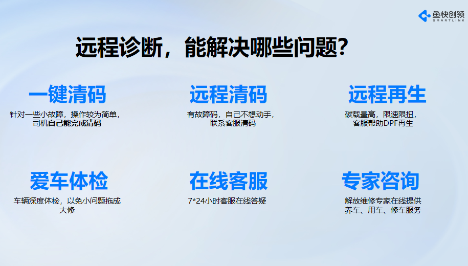 基于鱼快车联网远程诊断技术,为用户提供一键清码、远程清码、远程再生、在线客服、专家咨询等在线服务,降低无效进站,节省用车成本,重新定义“故障不趴窝”的新标准。
