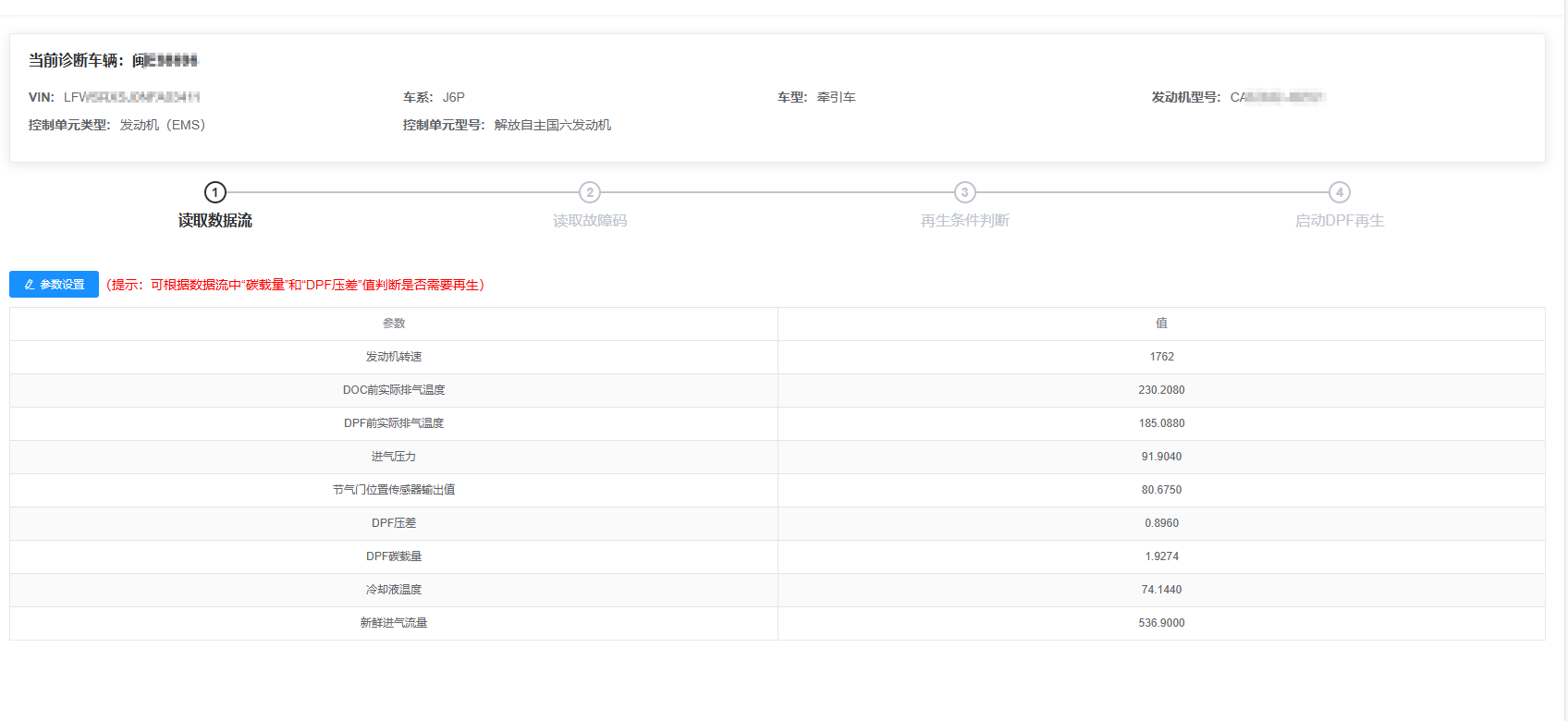 • 基本参数:限扭状态、碳载量、碳载密度、水温、机油压力、蓄电池电压、尿素液位、尿素浓度等